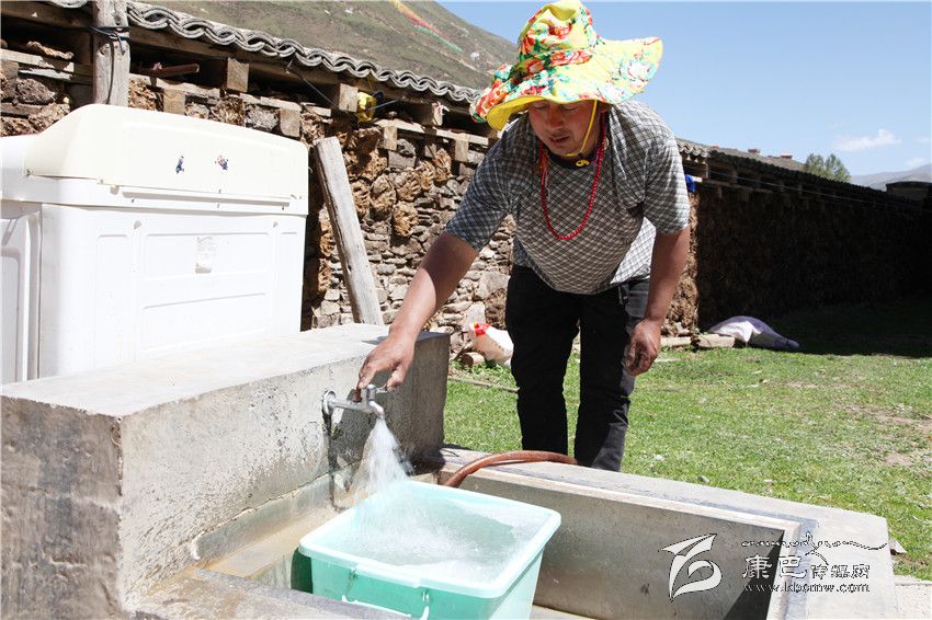 這是一幢位于半山坡上的漂亮藏房,這是一座寬敞干凈的農(nóng)家院落。正在院子里的水龍頭前洗衣服的布窮拉,一面羞紅著臉招呼著我們,一面將洗衣粉撒進洗衣機里,高速運轉(zhuǎn)的洗衣機不時拋出幾朵洗衣粉泡沫。說起自來水,不善言辭的布窮拉確實感觸尤深:“我家附近只住了4戶人家,根本就沒想過這輩子還能用上自來水。去年鄉(xiāng)上在實施第二批人口安全飲水工程項目時,居然也把我們幾家規(guī)劃進去了。當時,我以為只是說說而已,沒想到20來天后施工隊果真就把水管鋪設(shè)到了我家。通水那天,我們幾家人還特意慶祝了一盤。如今,我再也不用每天往返到色曲河背水了,我家的背水塑料桶隨之也就‘下崗’了。”
